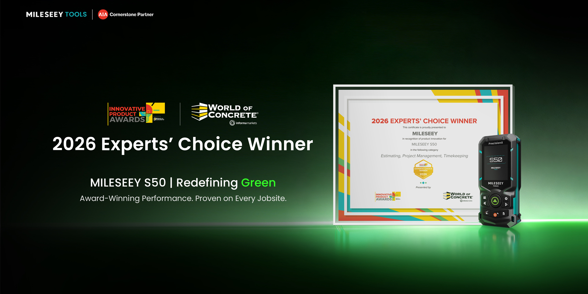 The MILESEEY S50 wins Experts’ Choice at the 2026 World of Concrete Awards, recognized for innovation, precision performance, and advanced green-beam technology.