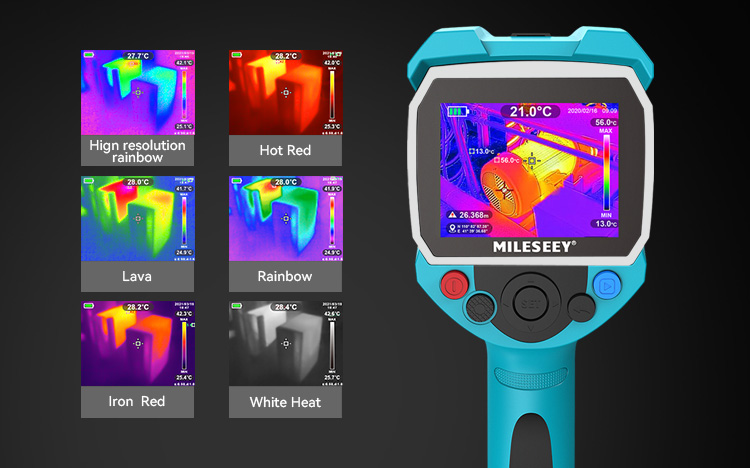 Warning for hot/cold temperature, 6 color palettes - High Resolution Rainbow, Hot Red, Lava, Rainbow, Iron Red, White Heat for clearer view and easier analysis.