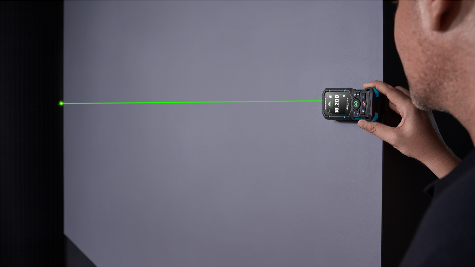 The S50’s green-beam laser is 4× more visible than red laser, ensuring easier long-range targeting, particularly in outdoor conditions, and supporting precise measurements up to 400 ft.